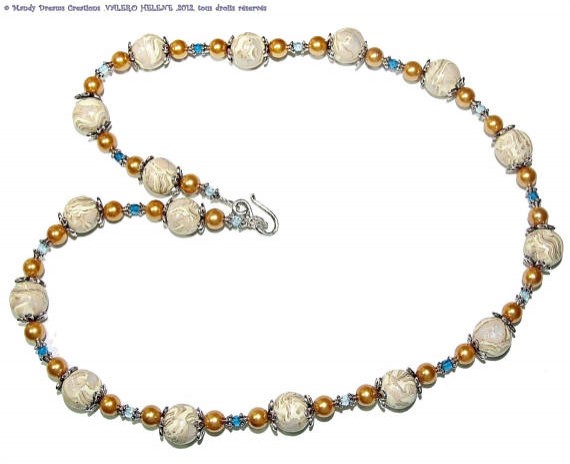 Composé de perles que j'ai modelé en fimo sable, crème , effet de transparence, avec inclusion de feuilles argentées et dorées, de perles en verre recouvert nacre dorée,d facettes cristal de bohême,de corolles argentées....élégant et lumineux !