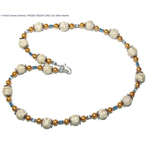 Collier lumineux doré et sable,fimo,cristal ,unique.