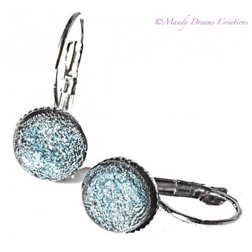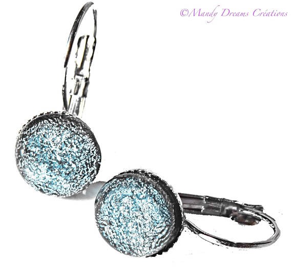 Dormeuses, boucles d'oreilles, en verre dichroïque pétillant et lumineux argenté et bleu clair.
