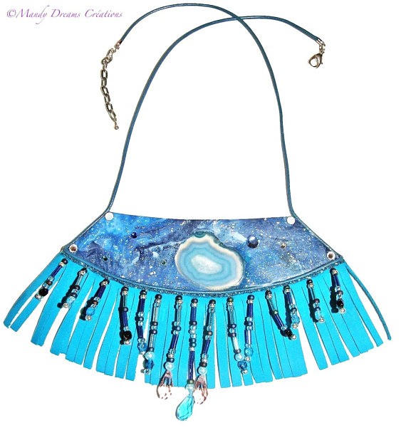 Collier plastron créateur fimo bleu , Agate bleue,cuir de veau ,strass cristal