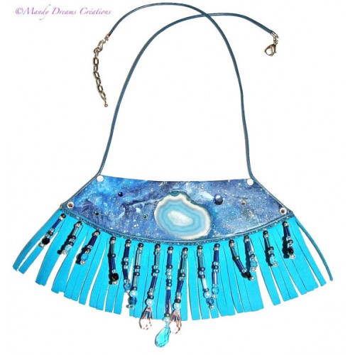 Collier plastron unique et moderne. Entourant une Agate naturelle au tons bleu ciel voici un plastron en fimo modelé main(divers bleu brillant pailleté avec feuille argenté ) que j'ai ensuite décoré de plusieurs strass en cristal de swarovski. Plastron moderne cerclé d'un cordon en cuir véritable se finissant par une chaînette de rallonge et goutte argentée.