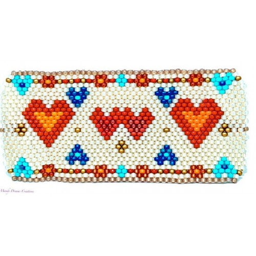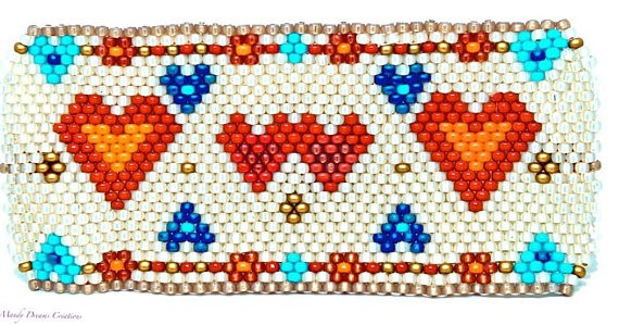 Bracelet manchette original aux motifs coeurs. Idée cadeau saint Valentin. Bracelet lumineux . que j'ai tissé à la main avec des perles Miyuki(rocailles japonaises de marque, en verre)... avec 8 couleurs différentes brillantes, mates ou nacrées .Travail très long et minutieux minutieux, tissé perle après perle(technique peyote).Plus beau en vrai car il m'est très difficile de rendre en photo la multitude de nuance des perles de fond crème aux reflets or...Pour vélo ci j'ai utilisé du roug,orange bleu turquoise opaque,crème aux reflets or,du doré etc.....